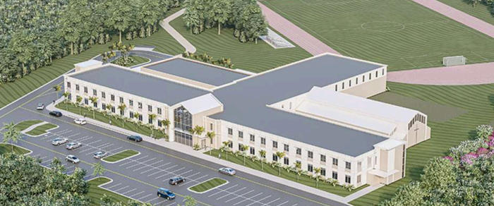 占地11英亩,室外⽥径场、⼈造草坪⾜球和多功能场地,将近7,300平⽅⽶的建筑包含42间教室、餐厅、艺术和⾳乐⼯作室、科学实验室、剧院和体育馆。