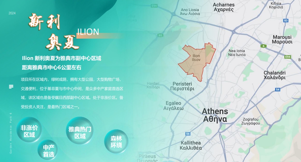 项目位于雅典新利奥夏区最南端,紧邻佩里斯特里,周边绿树成荫,森林环绕,生活配套 齐全,距离雅典西部最著名商业街区 Bournazi 广场仅 1.2 公里,步行 15 分钟。区域内有 大型公园,购物广场和医院,稀缺高端住宅项目,带私人庭院及顶楼私人花园,并且是目 前热门的非涨价区域 ,未来升值潜力大