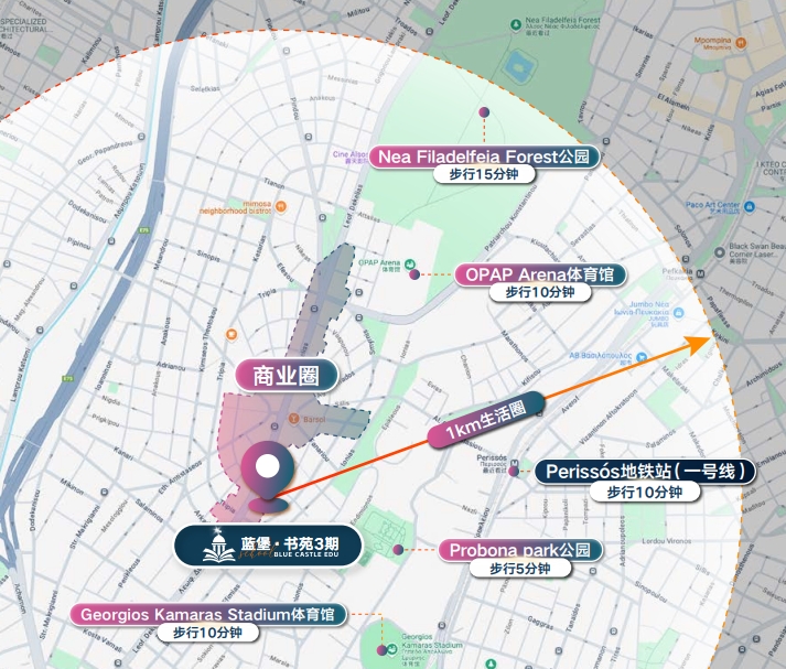 距离蓝堡·书苑3期500米。占地面积480公顷,是雅典著名的自然保护区和城市公园,以其宁静的环境、丰富的植被和悠久的历史,每年大约会吸引13-15万游客访问。NEA FILADELFEIA FOREST常常举办社区活动和文化节,如春季音乐会、跑步活动和社区聚会等,游客人数因此会大幅增加。