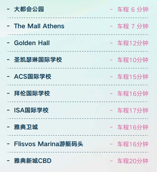 蓝堡·书苑3期10分钟车程内,覆盖多国使领馆,包括中国、加拿大和日本等。使得这里成为雅典重要的国际交流中心之一,也是雅典最具代表性的高端社区之一。这里汇聚了来自世界各地的外交官、国际组织成员以及外籍高管,社区氛围充满多样性和开放性。使馆区的独特地理优势和人文环境也使得其周边房地产市场需求旺盛,成为投资与居住的理想选择。